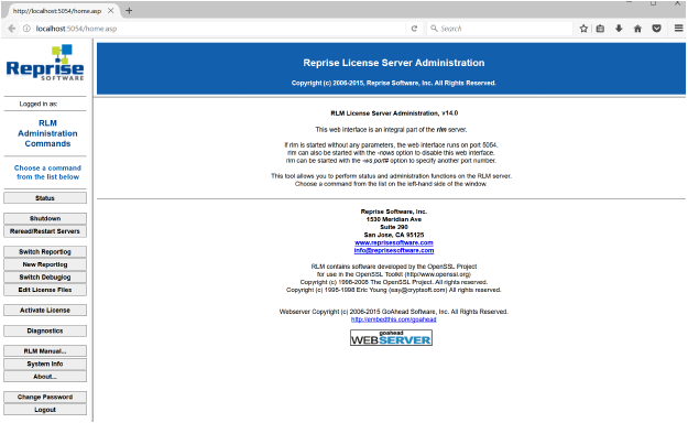 Displays the RLM server status, and provides access to many of the important ISV server operations. For more information, see Server Status screen. |